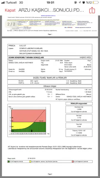 Meehabaa :) bizde ciktik kontrolden 5 gun ileri ciktik :) kocaman olmus kipir kipir ama inat etti cinsiyetini gostermedi :)) 1.2 ense kalinligimiz burun kemigi de gayet net gorundu :) kanimizi verdik ikili test icinde ❤