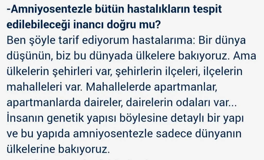 Okadar üzüldüm ki anlatamam. 4lü testim riskli çıkıp nift testi yaptırdığımda o sonucu beklerken ya kötü çıkarsa yı aklımın ucundan gecırırken bıle çıldıracak gıbı oluyordum. Ne yaparım düşüncesi benı korkutuyor,Onun ilk hareketlerını hıssettikçe aglıyordum. İnsan isyan etmese de sorguluyor Malesef. Etrafımda 40 yasında hamıle Bı tanıdıgımın degıl de benım 4lümde risk cıkmasını sorgulamıştım bende :/ sürekli dua ettim sürekli. Temiz cıktı. Hatta bugün şükür namazı kıldım. Rabbim şu mübarek aylarda size de Bi mucize yaşatsın inşallah. Tüm yüreğimle dua edıyorum size ve bebeğinize. Allahım olmazı oldurur. Ol der olur. Ümidinizi kaybetmeyin.. Hepimizin duaları sizlerle.