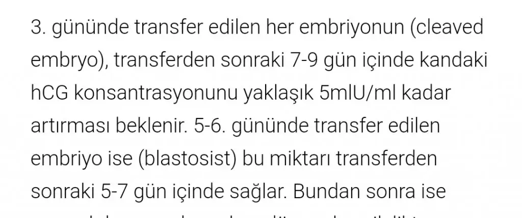 Canim benim de 4. Gun embriyosu 8. Gun kan testi yaptircam.herkese selamlar...5.gün embriyosu ağustos 4 de transfer edildi. 7.günü beta hcg değeri 1,2 den küçük çıktı. Bu sabah da hafif kırmızı lekelenmem oldu... Doktora yazdım ilaçları kes dedi...