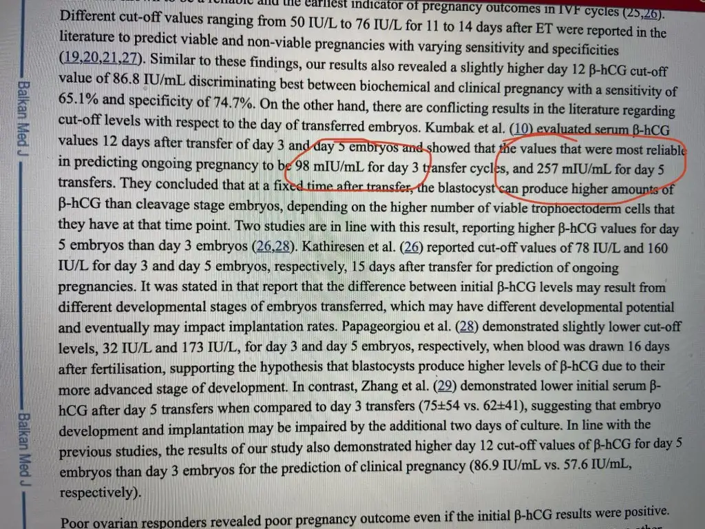 kızlar bugün bilimsel bir makale okudum. Bu araştırmaya göre, 12. Gün yapılan kan testinde eğer 3. Gün transferiyse 98, 5. Gün transferiyse 257 beta-HCG değeri ölçüldüyse yüksek ihtimal embriyo tutunmuş demek ve düşük riski az demekmiş. Tabii değerleriniz düşükse de endişelenmiyoruz testi tekrarlayıp gelişime bakıyoruz.