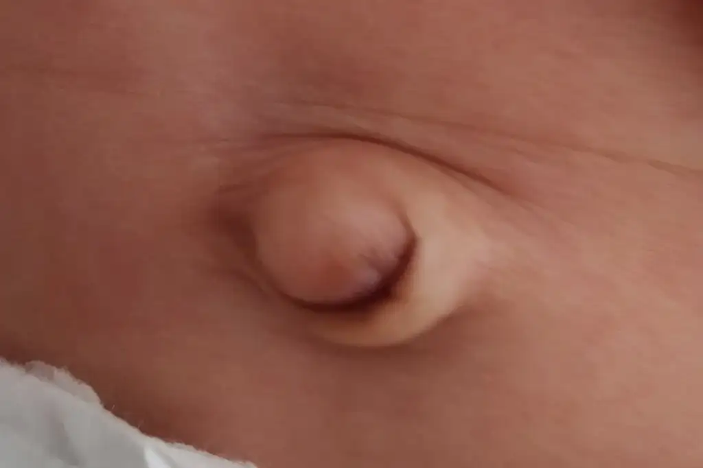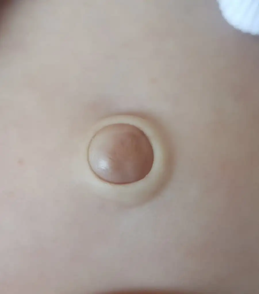 fıtık olmuş. çok ağlıyormu ya da ıkınıyor mu? o sebeple oluyor.para koyulup sarıldığını falan duydum ama doktora sorsan iyi olur.