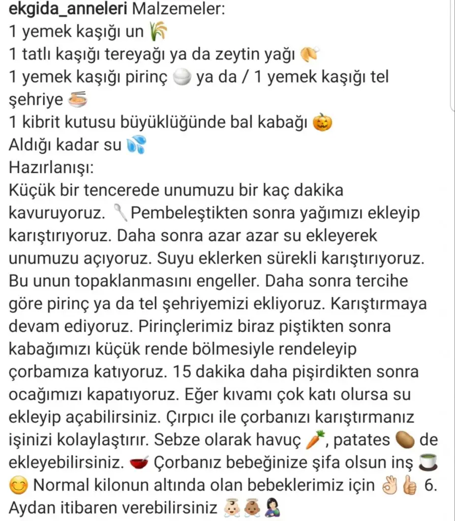 Ya bizim dr pirinc verme dedi sadece sebze corbasi yada tarhana mercimek falan verceksin.princle sisirme emmez dedi anne sutu alsin dedi.birde kiymayi kavur dedi neden kavurup buzluga koyuyoruz patik olsun diyemi.ben cigden kup kup yaptim pisirecegim zaman kavuruyorumda.Drda oyle dedi pratik olsun diye sanirimÇorba da farklı tarif arayan annelerimiz varsa ben bugün şunu yaptım benim minnoş çok sevdi. Bu arada dün (7 Ay 1 haftalıkken) kıymaya başladım. Kıymayı kavurdum,1 tatlı kaşığı olacak şekilde poşetlere ayirdim. Dün de bugün de çorbası pişmeye yakın içine attım. Sevdi kızım.sukur. bu arada çorbaya tatlı patates rendeledim