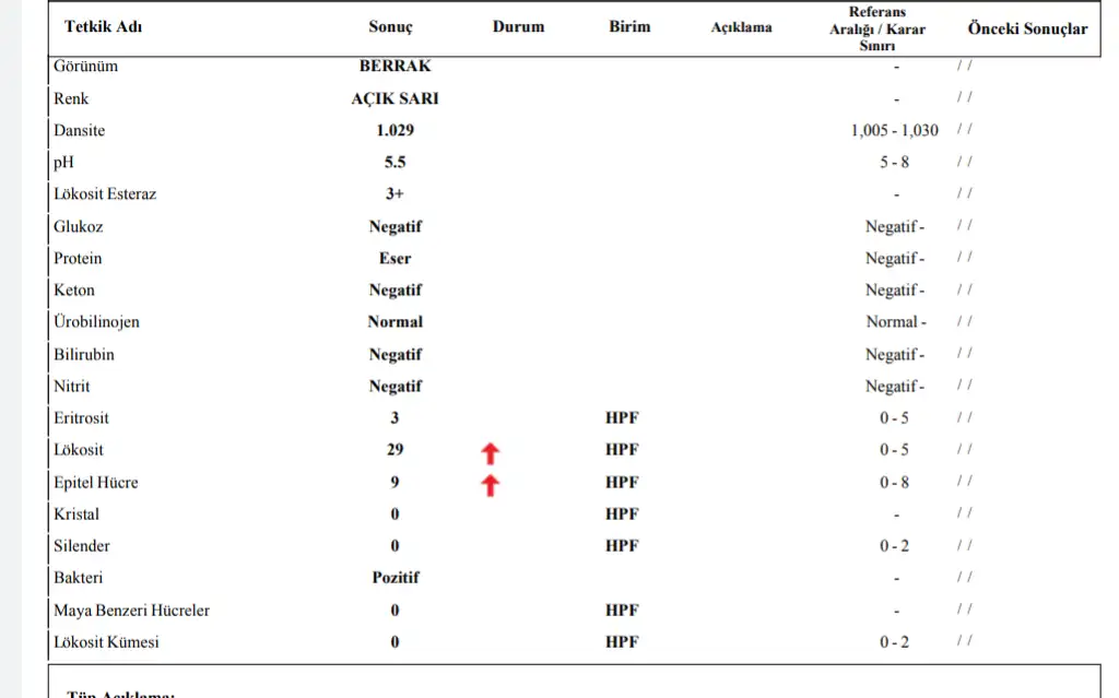 Bendede çıkmıştı biraz enfeEnfeksiyon var. Eser miktarda da protein çıkmış.