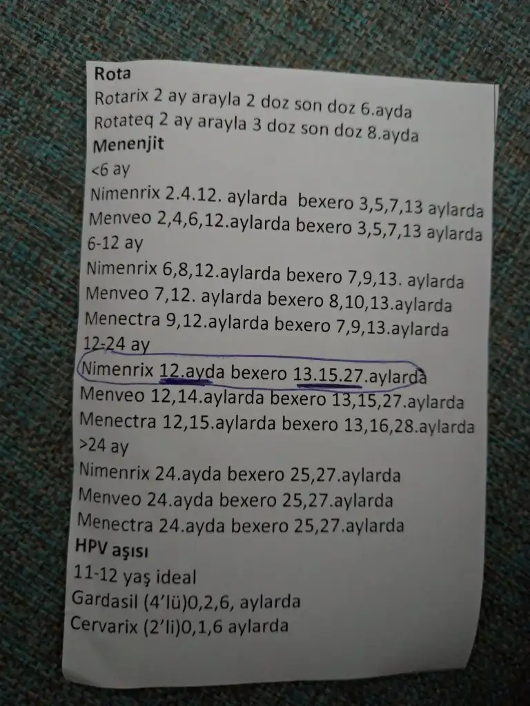 Nimenrix 9. Ay ve 13. Ay 2 doz olarak konuştuğumuzu hatırlıyorumMenenjit yaptiranlar ve yaptiracak olan arkadaslar doktorunuz size kac doz vurdurmanizi soyledi ? Bana bu kagidi vermisti 3 doz aşı kafami karistirdi