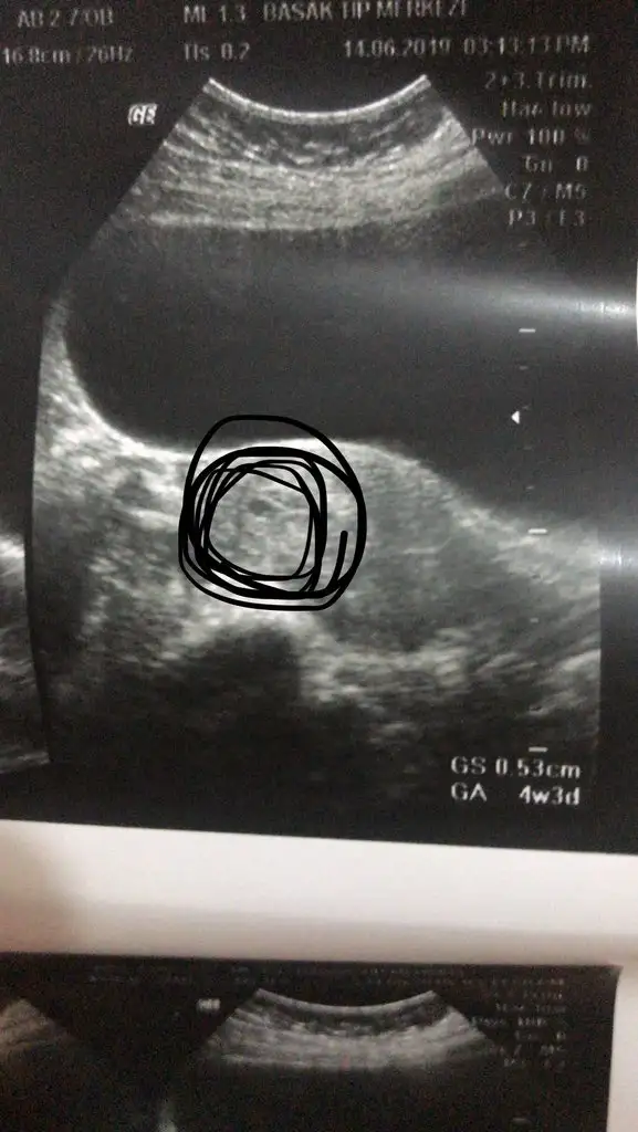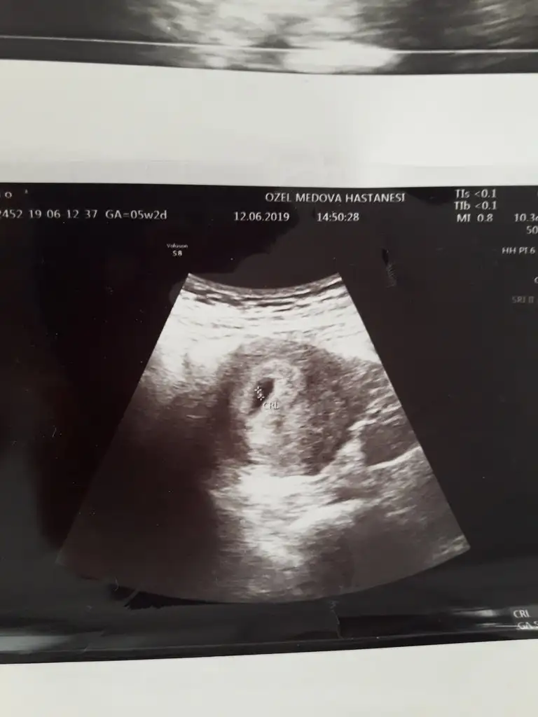Bunu dün aldım, aslında giderken neredeyse 6 haftalık olmuştur kalbini duyabilirim diye gittim ama 4 yada 4,5 haftalık dedi doktor. Sat 11 Mayıs ve 10 Haziran'da hcg 741 çıkmıştı. Doktor üstten keseyi tam göremediği için alttan baktı ve bunu gördü sadece kalp atışını duyarız belki dedi ama kese içinde birşey görememiş çok mutsuzum şu anda. Birde ilaç kullaniyordum gyno lomexin akıntı vardı ve kaşıntı doktor fazla etki etmez ama ben olsam bunu vermezdim bebek düşünen birine dedi aklım çok karışık bel ağrısından ölüyorum. Doktora söyleyemedim bile ağrımi öyle küçük çıkınca.
