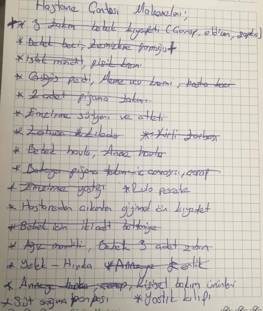 Canım ben böyle liste yaptım. Yanıma aldıklarımında üzerini çizdim . Yazım biraz kötü ama idare eder işteKüçük boy valize koyalım tatile gitmiyoruz demişti eşim, valiz doldu daha içinde bez mama biberon göğüs pompası yok. Kahve kupa koyacaktım onlarda konulmadı daha.