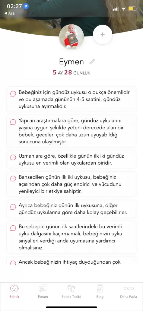 Evet uygulamada da o şekilde bilgi varKameradan bakıyorum bizimki zaten şak diye açıyo gözleri öyle bi yavaş ayılma olmuyo oyalanıyor sonra biraz sıkılınca ses yapmaya başlıyor. Bide bir yerde okumuştum toplam gündüz uykusu 3 saatten az 4.5 saatten fazla olmıcakmış ona uygun. yarım saat dedi mi uyanıyor öğlen ama acil bi işimiz varsada evden cıkcaksak falan 2 saat uyuyor şaka gibi yani.