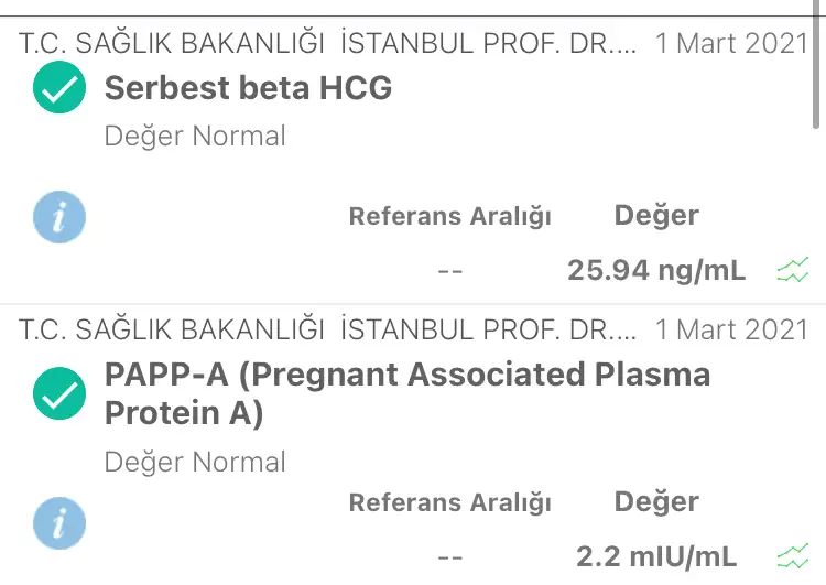 Saniyorum bir rapor cikmasi gerekiyor. Renkli grafikli o esas sonuc oluyor.Kizlar selam, dün devlet hastanesinde tanidigim var diye ikili testimi orda yaptirdim kendi doktoruma haftaya gidecegim. Ultrasonda hersey normal cikti NT:0.9 du sanirim burun kemigide vardi. Kan sonucum cuma cikicak dediler mesaj geldi simdi cikti diye baktim ama bisey anlamadim anlayan varsa bunun normal olup olmadigini soyleyebilir mi? Referans degeri yazmadigi icin bi tahminde bulunamadim :/ Eki Görüntüle 2793723