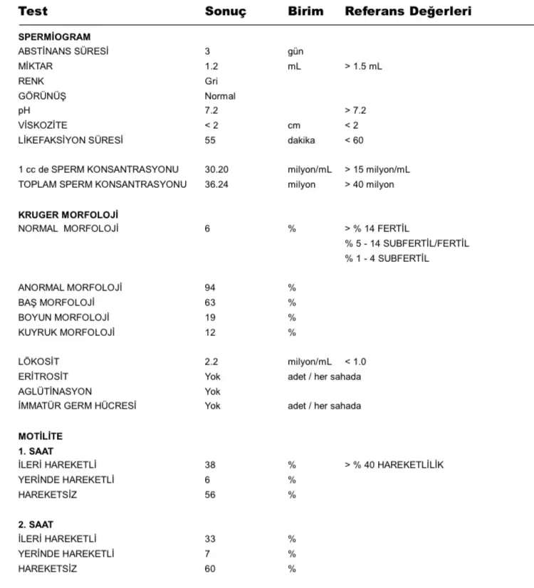 Aşılama denediniz mi ??Taze anneler hepinizi tebrik ederim. Allah sağ salim evlatlarınızı kucağınıza almayı nasip etsin2,5 yıldır deniyoruz. Benim hormon, yumurta, rahim vs hiç bir sıkıntı çıkmadı. Eşimin bugün spremiogram sonuçları çıktı. Biraz sayı ve hızı yavaş cıktı. Sizlere danışmak istediğim. (Test sonucunu fotograf olarak ekledim) aşılama hangi durumlarda tercih edilmeli? Bu arada ben 29, eşim 39 yaşında. Aşılama mı, tüp bebek mi? arasında kaldım..Doğal yolla olmayacagını kabullendim.