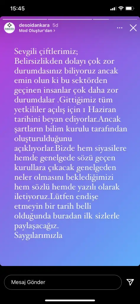 Gittiğimiz tüm yetkililer Düğün,kına,nişan ve nikahların 1 haziranda kesin olarak açılacağını belirtiyorlar.Ancak bu açılmanın nasıl olacağı bilim kurulu ile konuşulduğunu bilim kurulunun belirli şartlar öne sürdüklerini belirtiyorlar.Bizler de Hes kodu ,maske ve mesafe kurallarına ek olarak yemek ve ikram servisine,canlı müziğe izin verilmesini sürenin en az 2.5 saat olmasını gittiğimiz her yetkiliye belirttik.