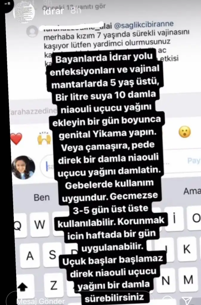 1 su bardagı sirkeye 2.5 -3 su bardagı su şişede karıstır ve banyoda bolca taharetlen , ben 4 aylık hamileliğimden beri öyle yapıyorum, akıntılarım için doktor önermişti. Ayrıca eklediğim 2 ekran görüntüsünü de uygulayabilirsin, yağı aktardan veya internetten alabilirsin etkili bir yağ gebeler için de kullanıma uygun. Ben dönem dönem kullanıyorum. Sebamedle de bazı kuruluk ve kaşıntı akıntı artışlarımda destek sağlıyorum.Bunu deneyecegm inşallh , teşekkürler