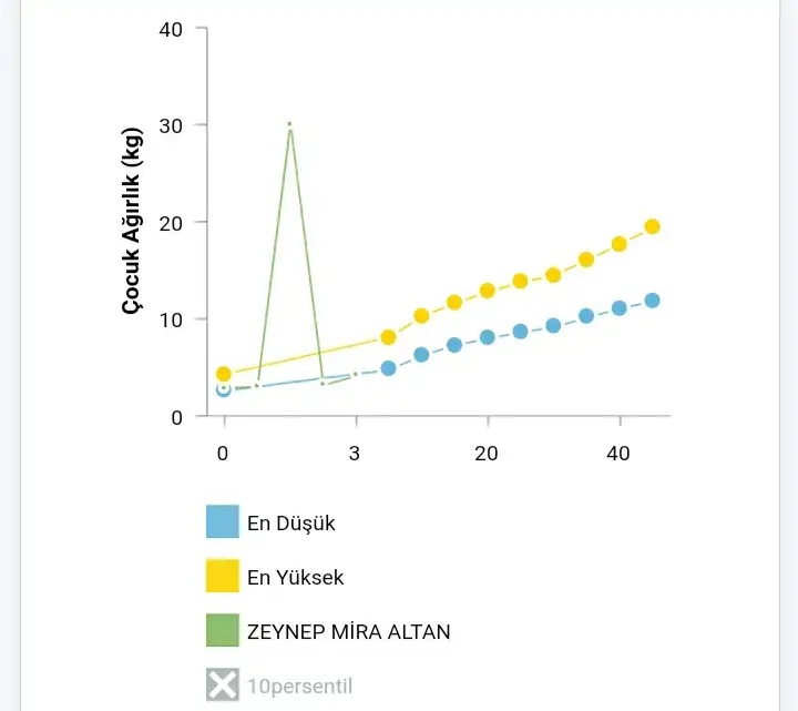 Benimki de sendeki gibi gösteriyor. Genel durumu gösteriyor yani hiç girilmemiş kg vs.Yok canım bizimki farklı galiba, yeşilin üstünde noktalar yok bizde. ayrıca bizim yeşil çizgi 27 - 28. aylara kadar gidiyor. yani bilgiler girilmediği halde nasıl ilerliyoki. Dediğim gibi bizimki geneli gösteriyor