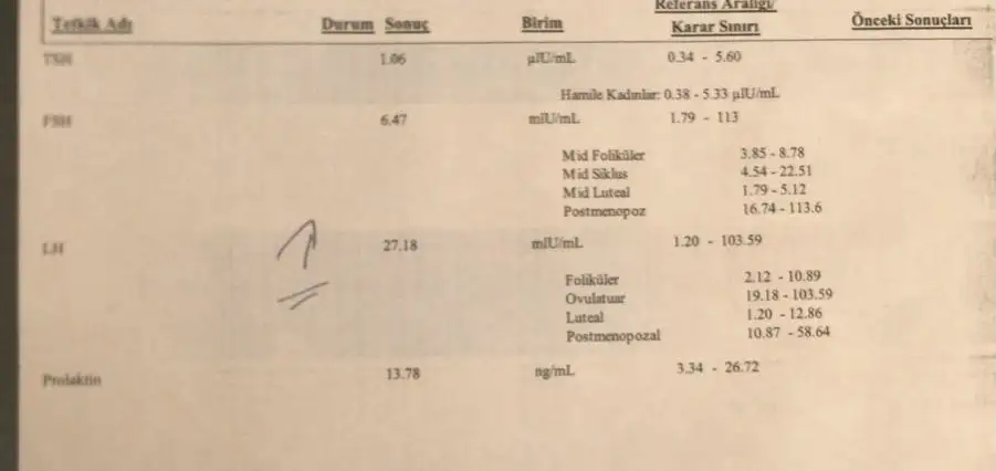 Benımde bugün fsh,tsh lh ve prolaktin baktı. Benimde lh zirvede ucuyorFsh lh e2 normal prolaktinn 20 di 28 olmus tsh yuksek serbest t4yuksek gerisi normal