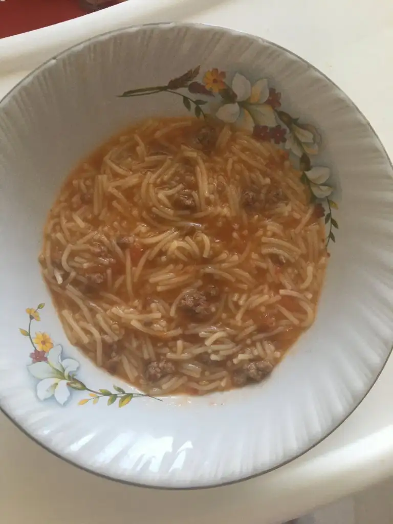 Bu akşam şehriye çorbası yaptım.1 ymk kaşığı kuzu kıyma,1 domates rendesi,3 ymk kaşığı şehriye, 1 diş sarımsak 1,5 su br su. Kaşığın ucuyla ev yapımı salçada ekledim.çok sevdi gerçi kıymalı makarna gibi oldu ama lezzetliydi 😊
