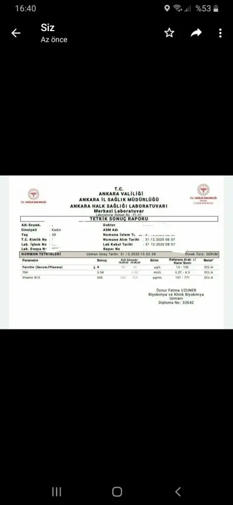 Hiç bisey canim sonuçlarına netten baktım pazartesi gidicem ben de değeri görünce hemen basladimBenim ferritinde 9 du ama demir ilacini hala 1 aliyorum sana ne dediler canim