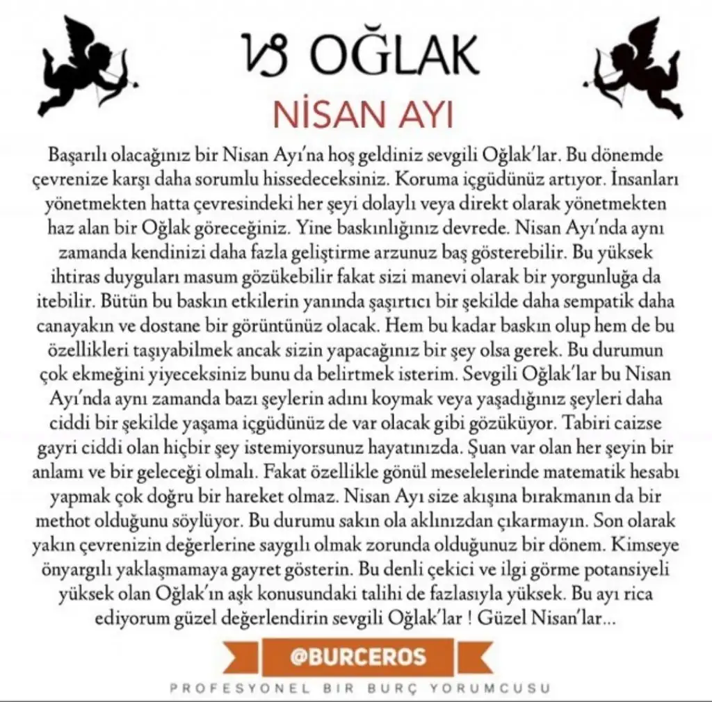 Gördüğün gibi Sevgili Oğlak ve Yükselen Oğlak, dolu dolu bir Nisan ayı bizi bekliyor, umarım kendini çok iyi hissettiğin şahane bir ay geçirirsin.