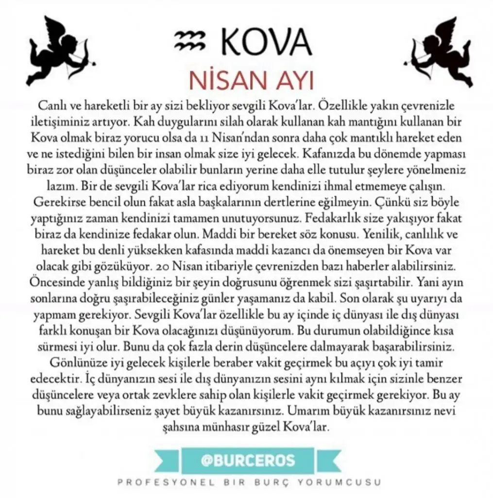 Gördüğün gibi Sevgili Kova ve Yükselen Kova, dolu dolu bir Nisan ayı bizi bekliyor, umarım kendini çok iyi hissettiğin şahane bir ay geçirirsin.