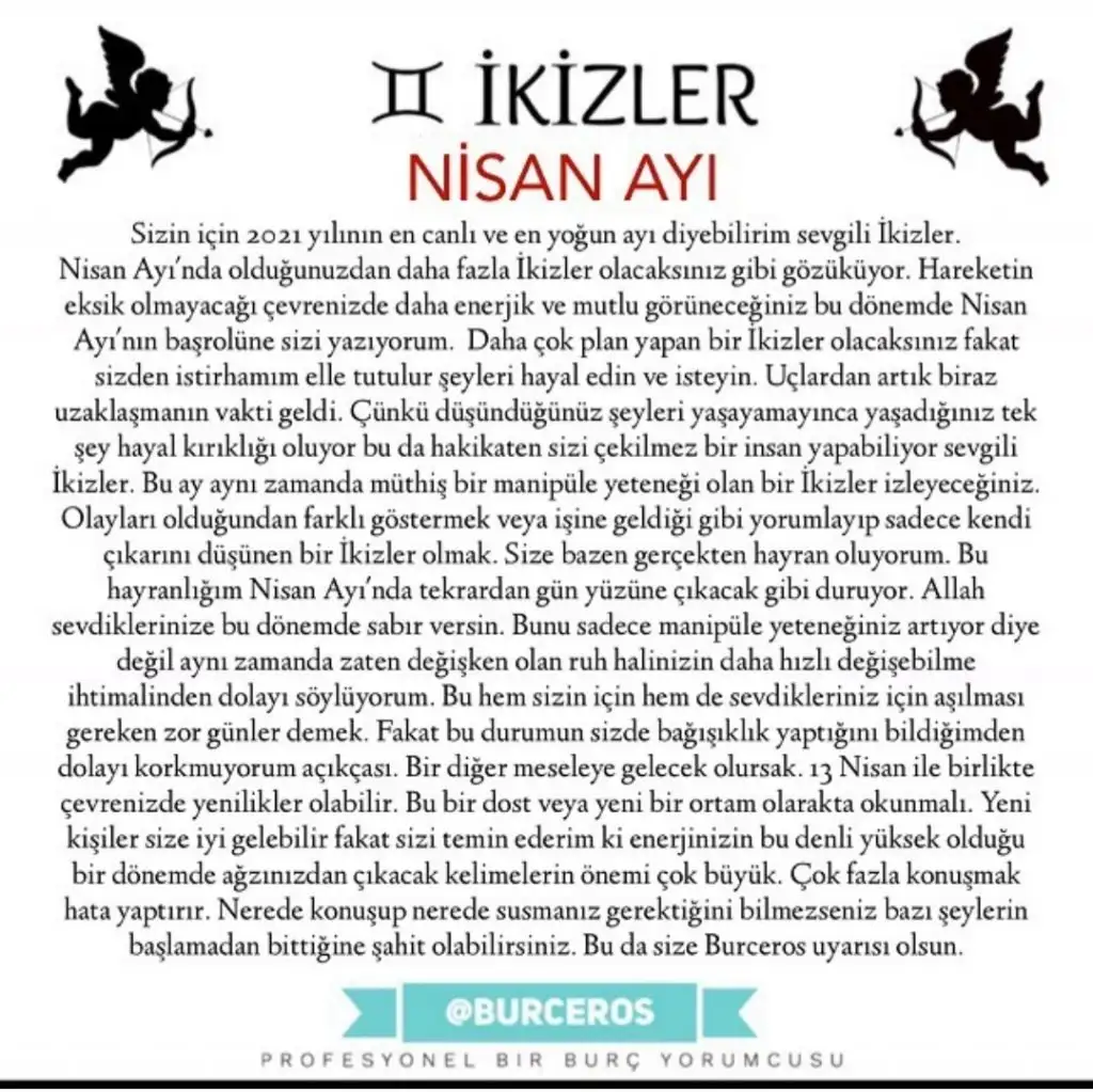 Yükselen İkizler ve İkizler Burçları Nisan Ayı Burç Yorumu: Sevgili İkizler burçları bu ay mahkeme ya da yasal konularda bazı problemler yaşayabilirsiniz. İçinizde yaşadığınız karmaşalar sebebi ile verdiğiniz kararlardan ya da sözlerden pişmanlık duyabilirsiniz. Kendi otokontrolünüzü sağlamaya çalışın lütfen. Aile içerisinde hoş olmayan konular gündeme gelebilir sabırlı ve hoşgörülü olmaya çalışın.