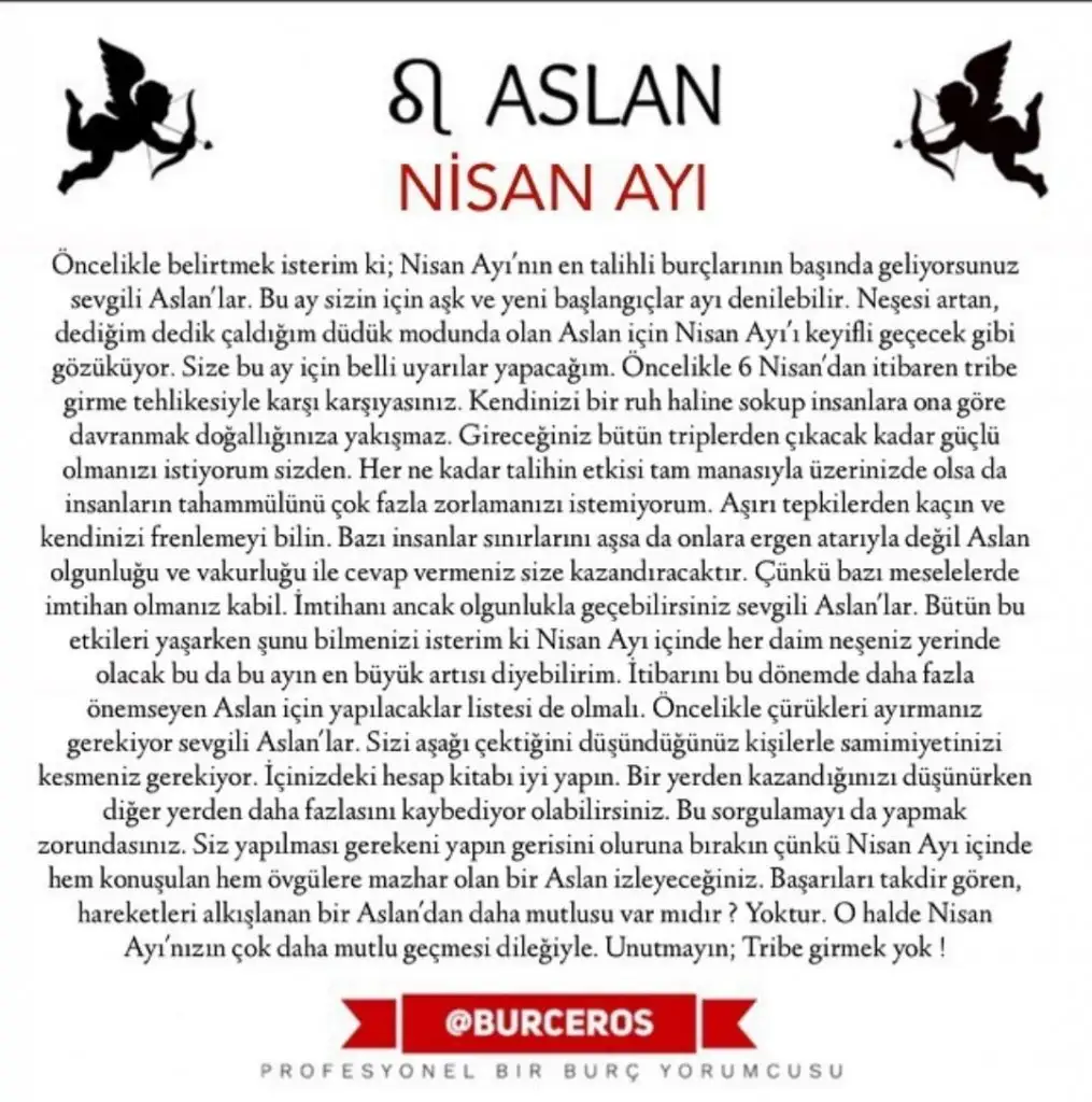ASLAN: 4 Nisan’da Merkür Koç burcuna geçiyor. Yurtdışı bağlantılı işlerinizde veya satış, pazarlama, reklam gibi işlerinizde ya da ticari işlerinizde çok detaylı inceleme yapmadan aceleci bir takım girişimlerde bulunmak isteyebilirsiniz. Bu dönem iletişiminiz çok artacaktır, tutamayacağınız sözler vermemeye özen gösterin. 10 Nisan’da Satürn’ün ay düğümleriyle kurduğu açılar ve diğer bazı göksel görünümler, yaşamınızda uzun süreli ve kadersel bazı başlangıçlara neden olabilir. Sosyal çevrenizdeki kişilerle olan iş girişimlerinize ve iletişim şeklinize çok özen gösterin, size olumlu veya olumsuz olarak geri dönme potansiyeli çok fazladır ayrıca yine bu süreçte yabancı ortamlardan bir kişiyle aşk ilişkisine başlayabilirsiniz. Çocuklarınızla ilgili yurtdışı bağlantılı bir eğitim de gündeme gelebilir. Bu dönemde atılacak olan adımlar uzun süreli ve kalıcı olacaktır. 14 Nisan’daki Güneş, Mars altmışlığının etkisi altında olduğunuz günlerde kısa veya uzun mesafe yolculuklarınızda trafik kazalarına karşı çok dikkatli olmanızda yarar var. Mars’ın son derece agresif olan enerjisi kazalara ortam hazırlar. 19 Nisan’da önce Merkür sonra Güneş Boğa burcuna geçiyor. Bu süreçte kariyer hayatınızla ilgili ve yaşamınızın geneli ile ilgili daha aklıselim, daha tutarlı fikirler geliştireceksiniz, yalnız düşüncelerinizde esnekliğe özen gösterin. Bu süreçte Venüs’ün de Boğa burcunda olması kariyer ilişkilerinizde de uzlaşmacı bir tutumda olduğunuzu gösterir. Verimli ve güzel bir dönemdir bu. 24 Nisan’daki Merkür, Uranüs kavuşumunun etkisiyle, kariyerinizde sıra dışı fikirlerle işlerinizi geliştirme veya sorunlarınızı çözme yoluna gidebilirsiniz. 27 Nisan’daki Akrep Dolunayı aile içinde gizli kalmış bazı konuların açılmasına ve bazı çatışmalar yaşanmasına neden olabilir. Dolunay, akrep burcunun etkisiyle daha önce manipüle edilmiş krizli konuları gün yüzüne çıkarır. Çözüm bulmak bu süreçte biraz zordur. Ancak bu durum farkındalığımızın artmasına neden olur.