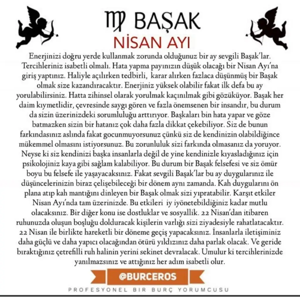BAŞAK: 4 Nisan’da yönetici gezegeniniz Merkür Koç burcuna geçiyor. Miras, ortak gelirler, vergiler, krediler gibi konular gündeminize gelebilir. Bu konularla ilgili yeni çözüm arayışlarına gidebilirsiniz. Çok düşünmeden ve acele hareket etmeniz hata yapmanıza ve bu konularda kriz yaşamanıza neden olabilir. Sakin. 10 Nisan’daki Satürn’ün ay düğümleriyle yaptığı açılar ailevi konular ile iş hayatınız arasında bir karar aşamasına geleceğinizi gösteriyor. Bu görünüm ev, iş, kariyer konuları arasında denge kurmanız için destekleyici bir görünümdür. Bu dönemde alacağınız kararlar kalıcı olacaktır, bunu düşünerek hareket etmeniz önemlidir. 14 Nisan’da Venüs 9. evinizdeki Boğa burcuna geçiyor. Yurtdışı bağlantılı ilişkilerinizde destekleyici bir görünümdür bu. İlişkiler uyumlu ve sonuçları sizin açınızdan bereketli olur. Aynı zamanda akademik gelişmeler için de çok olumludur. Aniden karşınıza bir fırsat çıkabilir. 16 Nisan’da İkizler burcundaki ay’ın hilal faz’ı kariyer hayatınızı destekleyecek yeni bir eğitime başlamak için oldukça iyi bir görünümdür. Bu görünüme 17 Nisan’da Jüpiter’den de destek gelip bazı güzel fırsatların karşınıza çıkmasına olanak sağlayacaktır. 19 Nisan’daki Güneş Merkür kavuşumu ortak gelirlerinizle ilgili veya miras konularıyla ilgili çözüm odaklı fikirler üretmenizi destekler niteliktedir. 23 Nisan’da Mars’ın Yengeç burcuna geçişi, sosyal ilişkilerinizde daha mesafeli olup, kendinizi daha korumacı bir tavırla hareket etmeye yönlendirecektir sizi. Gelecek projelerinizle ilgili de kendinizi daha güvenceye alarak adım atmak isteyeceksiniz.