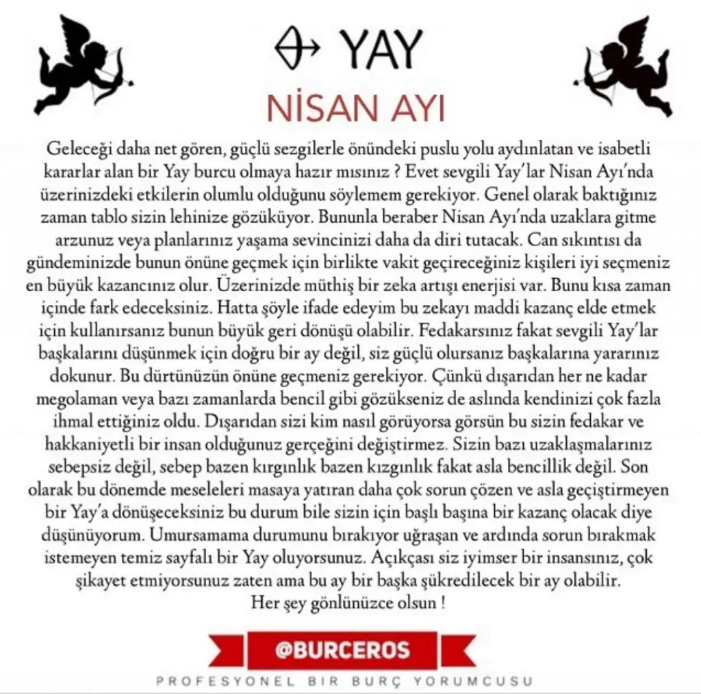 ♐️ Yay ve Yükselen Yay Burcu: Merkür'ün koç burcuna geçmesiyle 19 nisana kadar aşk, ilişkiler, çocuklar, zevkler, hobiler ile ilgili konuşmalar,düşünceler hakim olacak olabilir. Aşk ve ikili ilişkilerinizi çok fazla masaya yatırmak isteyebilirsiniz. Zihniniz hobileriniz, çocuklarınız, aşk hayatınızla meşgul olacak. Daha sonra venüs boğa burcuna geçiyor ve siz bu ay iş arkadaşlıklarınızla güzel bağlar kuracak olabilirsiniz. Beraber çalıştığınız kadınlardan destekler görebilirsiniz. Çalışmayı, üretmeyi sevdiğiniz bir dönem olacak sizler için. Evcil hayvanlarınız için de şanslı bir dönem. 19 nisandan sonra merkürün boğa burcuna geçmesiyle boyun ve boğazla ilgili rahatsızlıklar çıkabilir. İş arkadaşlarınızla fikir çatışmalarına girmemeye özen göstermelisiniz. Günlük işlerinizi kolay çözümleme, kendinizi rahat ifade edecek olabilirsiniz. 23 nisandan sonra mars yengeç burcuna geçecek ve siz ortak mallarınız, aile geliriniz veya eş geliriniz ile ilgili konularda hareketlenmeler çıkacak olabilir. Ödemeleriniz ve harcamalarınız artacak olabilir. Ameliyat gibi konularda olumsuz sonuçlar alınabilir. Kavga ve tartışmalar içine girmemeye özen göstermeniz gerekebilir