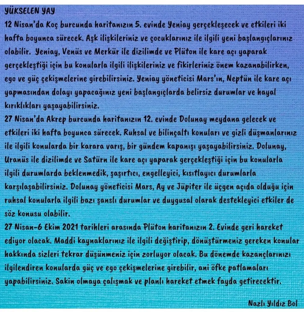YAY: Merkür 4 Nisan’da Koç burcuna geçiyor. Bu etkiyle düşündüklerinizi hemen uygulamaya koymak istersiniz. Bu dönemde yatırım konularında ya da ev, emlak, arsa alım satımıyla ilgili konularda alelacele karar vermemeniz yararınıza olur. Önünüze çıkan fırsatlar birden heyecanlanmanıza neden olur, hemen eyleme geçmek isteyebilirsiniz ama bu acelecilik hata yapmanıza neden olabilir. Bu dönemde aşık olduğunuzu düşünüp yeni bir ilişkiye de başlamak isteyebilirsiniz. Sakin. Merkür’ün Koç seyahati sırasında Mars ile yapacağı açı nedeniyle taşınmanız veya tadilat gibi işler de söz konusu olabilir. Bu ay çocuklarınızla, eşinizle ve ortaklarınızla olan ilişkinizdeki iletişim şeklinize dikkat edin. Acelecilik nedeniyle kendinizi doğru ifade edemeyebilirsiniz veya karşınızdakini doğru anlamayabilirsiniz. Sürtüşmeler ve çatışmalar söz konusu olabilir. 10 Nisan’da Satürn’ün ay düğümleriyle yaptığı açılardan dolayı, yakın çevrenizdekilerle olan iletişiminiz, ticari hayatınızdaki kişilerle olan iletişiminiz, eşinizle veya ortağınızla olan iletişim şekliniz veya eğitim hayatınızla ilgili bu dönemde oluşacak sıra dışı gelişmelerin uzun döneme yayılarak kalıcı olma ihtimali vardır. Bu dönemde alacağınız kararlar yaşamınıza yeni bir yön verecektir. 14 Nisan’da Venüs yöneticisi olduğu Boğa burcuna geçiyor. Günlük işleriniz daha keyifli hale gelebilir bu süreçte. Ekonomik olarak eliniz bollaşabilir, keyfi harcamalara dikkat. 17 Nisan’daki Mars, Jüpiter üçgeni ikili ilişkilerinizde süre gelen sorunlarınız varsa, çözmek için ve ilişkiye yeni bir vizyon getirmek için çok uygun bir pozisyondur. Aynı tarihteki Merkür’ün Jüpiter ve Mars ile altmışlığı da ilk adımı sizin atmanızı destekleyen bir görünümdür. 19 Nisan’da Merkür ‘ün Boğa burcuna geçişi ayağı yere sağlam basan yatırım anlaşmaları yapmanızı destekler niteliktedir. Bu süreçte aşk ilişkileriniz de daha güvene dayalı ve sağlamdır. 23 Nisan’da Mars Yengeç burcuna geçiyor. Mars bu burçta pek rahat değildir. Mars’ın Yengeç seyahati sırasında hem ikili ilişkilerinizde hem de ortaklı ilişkilerinizde ilk harekete geçen olmaktansa, kendini savunmaya alan bir davranış şekli benimseyebilirsiniz.