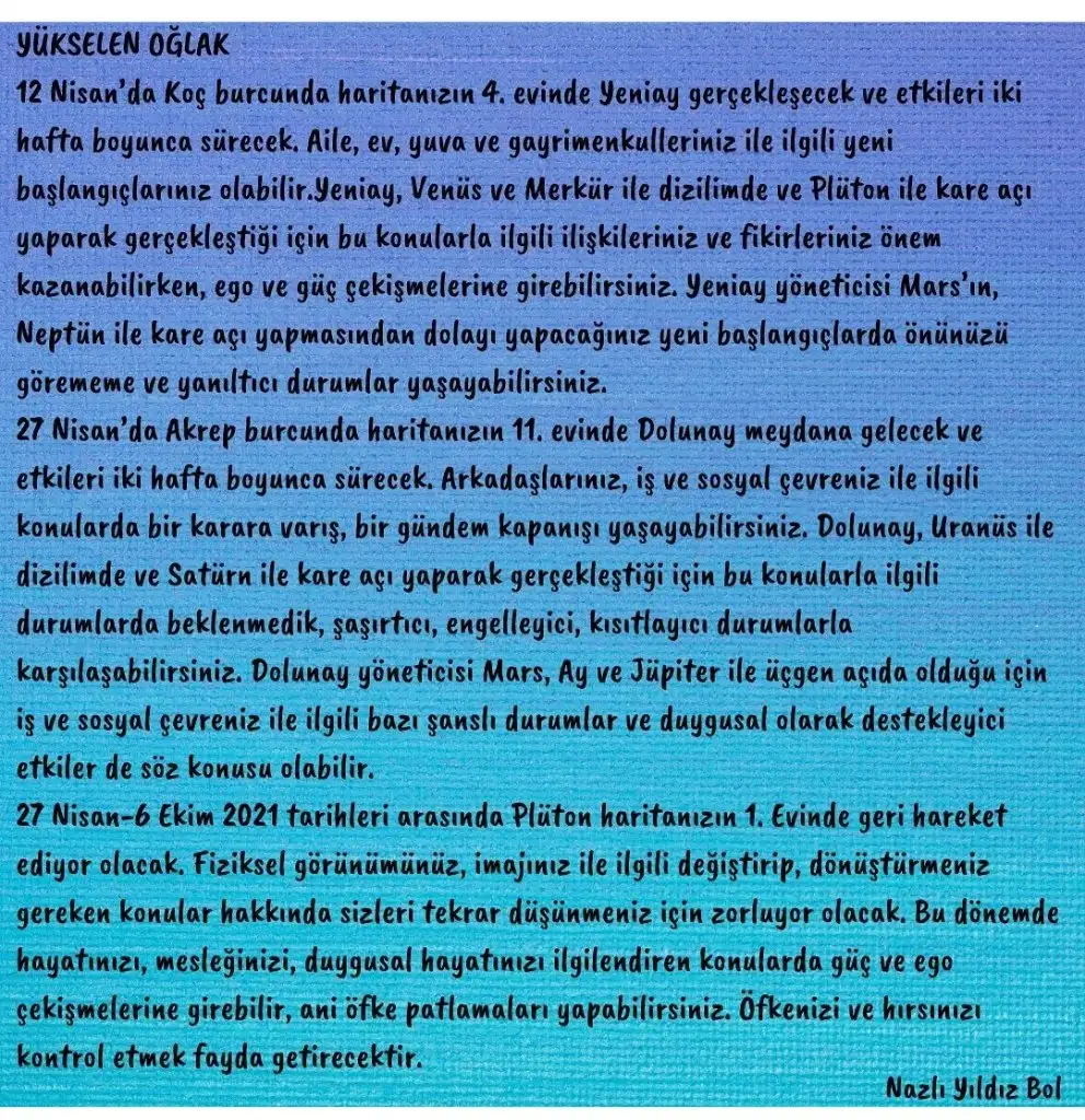 OĞLAK: 4 Nisan’da Merkür Koç burcuna geçiyor. Ev, emlak, arsa alım satımı, ev taşıma veya ebeveynlerle ilgili konularda aceleci olmak, düşünmeden hemen eyleme geçmek hata yapmanıza, aile içi muhalefete ve zarara uğramanıza neden olabilir. Özellikle işlerinizle ilgili yeni başlangıçları hemen yapmak için içinizde bir ateş yanabilir, kendinizi son derece istekleriniz için mücadele etmeye hazır hissedebilirsiniz ancak bu iç baskı yanlış yapmanıza neden olur. Nisan’ın ilk haftasında kendinizi frenlemeyi bilmeniz önemlidir. 10 Nisan’daki Satürn’ün ay düğümleriyle yaptığı açılar kişisel gelirlerinizi arttırmak için işinizle ilgili yapacağınız yeni bir ticari atılım eğer iyi planlanmışsa size uzun süreli bir gelir kapısı sağlayabilir. 14 Nisan’da Venüs Boğa burcuna geçiyor. Aynı tarihlerde Uranüs de Boğa burcunda seyahat ediyor olacak ani gelişecek bir aşkı özgürce yaşamak isteyebilirsiniz, bunun için keyfi harcamalarınız olabilir. Yine aynı görünüm ani olarak bir para kazancına da işaret edebilir. Daha önce yaptığınız küçük bir yatırım umduğunuzdan daha fazla bir kazanca neden olabilir. Venüs’ün Boğa geçişi bereketli bir zamanı işaret eder. 25 Nisan’da Satürn’ün Venüs ve Merkür ile yaptığı sert açı nedeniyle bu tarih civarında yatırım konularıyla ilgili alacağınız ani kararların zaman içinde size kalıcı sorunlar çıkarmasına neden olur. Bu dönemde yaşayacağınız bir aşk ilişkisinin de aynı riski taşıdığını unutmayın, yaşamınızda kalıcı veya uzun süreli sorunlara neden olabilir. 27 Nisan’daki Akrep Dolunay’ı sosyal yaşamınızda ve arkadaş çevrenizde bazı krizler yaşamanıza neden olabilir. Arkadaş çevrenizdeki bazı kişilerin kıskançlık dürtüsüyle sizi manipüle ettiğini fark edebilirsiniz.