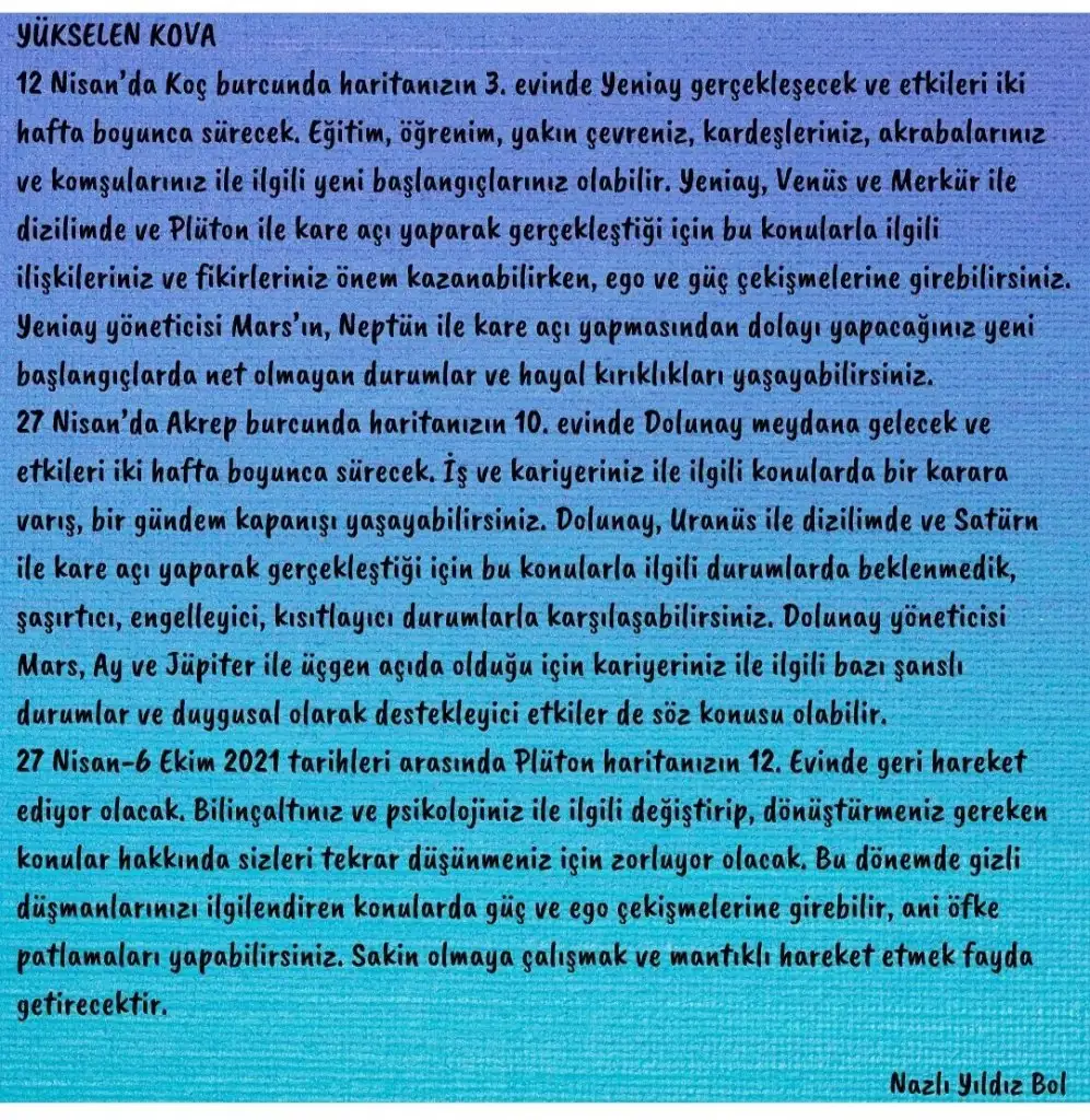 KOVA: 4 Nisan’da Merkür Koç burcuna geçiyor ve İkizler burcundaki Mars ile karşılıklı ağırlama yapıyorlar. Aynı zamanda Venüs ile Mars arasında da altmışlık bir açı oluşuyor. Bu da kardeşlerinizle ve yakın çevrenizdeki insanlarla iletişiminizin artmasına neden olacaktır, zaman zaman da iletişiminiz agresifleşebilir. Hayatınıza yeni insanlar ve yeni aşklar girer ve çıkar, kalıcı olmaz. Bol sohbetli bir süreç yaşarsınız ama her şey yüzeyseldir. Merkür’ün Koç seyahati sırasında trafiğe de dikkat etmeniz gerekir, kazalara çok açık bir pozisyondur bu. 10 Nisan’da Satürn’ün ay düğümleriyle yaptığı açılar, bu dönemde bazı kişilerle aranızda kalıcı ilişkilerin doğmasına neden olacaktır. Bu ticari bir iş ilişkisi olabilir veya yurt dışı bağlantılı bir proje nedeniyle sosyal çevrenizden bazı kişilerle geleceğe yönelik kalıcı bir adım atılabilir ya da bu dönem başlayacak sürtüşmeli bir ilişki aşk’a ve uzun süreli birlikteliğe dönüşebilir. Her ne olacaksa kalıcı olma potansiyeli vardır, o nedenle bu dönem adımlarınızı dikkatli atmanız gerekir. Kalıcı olmasını istemediğiniz herhangi bir şeye bu süreçte başlamamaya özen gösterin. Merkür’ün Satürn ile yaptığı altmışlık açı dikkatle karar almanızı kolaylaştıracaktır. Yine aynı tarihteki Venüs, Jüpiter altmışlığı parasal konularda sizi destekleyen bir pozisyondur. Hukuksal meselelerinizi halletmek için de bu dönemi kullanabilirsiniz. 14 Nisan’da Venüs Boğa burcuna geçiyor. Ailenizle birlikte daha çok zaman geçirmek isteyebilirsiniz. Bu süreçte ev ve toprak ile ilgili bir yatırım yapmak da isteyebilirsiniz. Ani, sürpriz gelişmelere açık olun. 19 Nisan’da Merkür’ün de Boğa burcuna geçmesiyle aileye yönelik yatırım konularında çok daha mantıklı düşünceler üreteceksiniz. 23 Nisan’da Mars Yengeç burcuna geçiyor. Sağlık konuları gündeminize gelebilir. Mide ve göğüslerle ilgili sorunlar yaşayabilirsiniz. Baş ağrısı çekebilirsiniz. Sağlığa dikkat. 25 Nisan’da Satürn’ün Venüs ve Merkür ile kare açısı nedeniyle, aile içerisinde parasal konularda veya miras konularında kişiler arasında çatışmalar, sürtüşmeler veya laf dalaşı olabilir. Ortamda karamsarlık ve mücadele vardır. O nedenle bu tip konuşmaları daha sonraya bırakmakta yarar vardır.