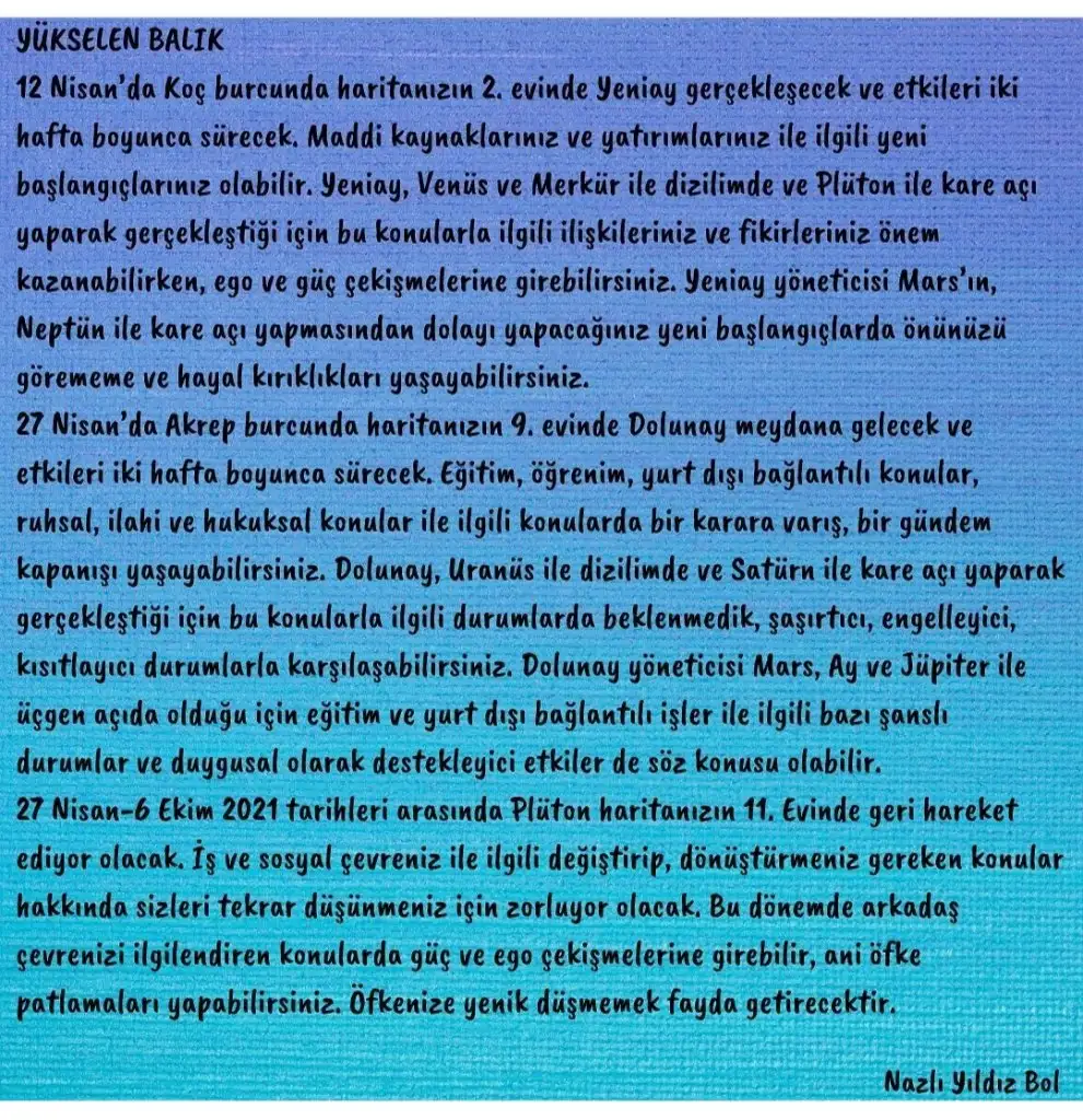 Gördüğün gibi Sevgili Balık ve Yükselen Balık, dolu dolu bir Nisan ayı bizi bekliyor, umarım kendini çok iyi hissettiğin şahane bir ay geçirirsin.