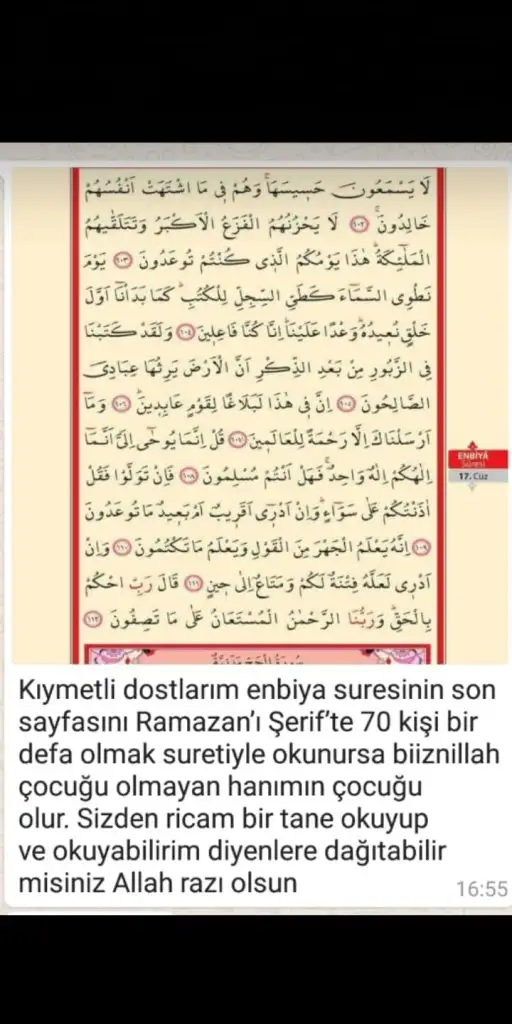 canım bende okuyabilirim.ama hangi kısmı okunacak foto atabilirmisinKızlar Ramazan ayında 70kişi Enbiya Suresinin son sayfasını 1kez okursa Rabbim evlat nasip edermiş.Kuran okuyabilenler okuyabilirmi acaba? Bu süreçleri sizler dışında kimseyle paylaşmadığım için kimseden isteyemedim yardımcı olabilir misiniz?