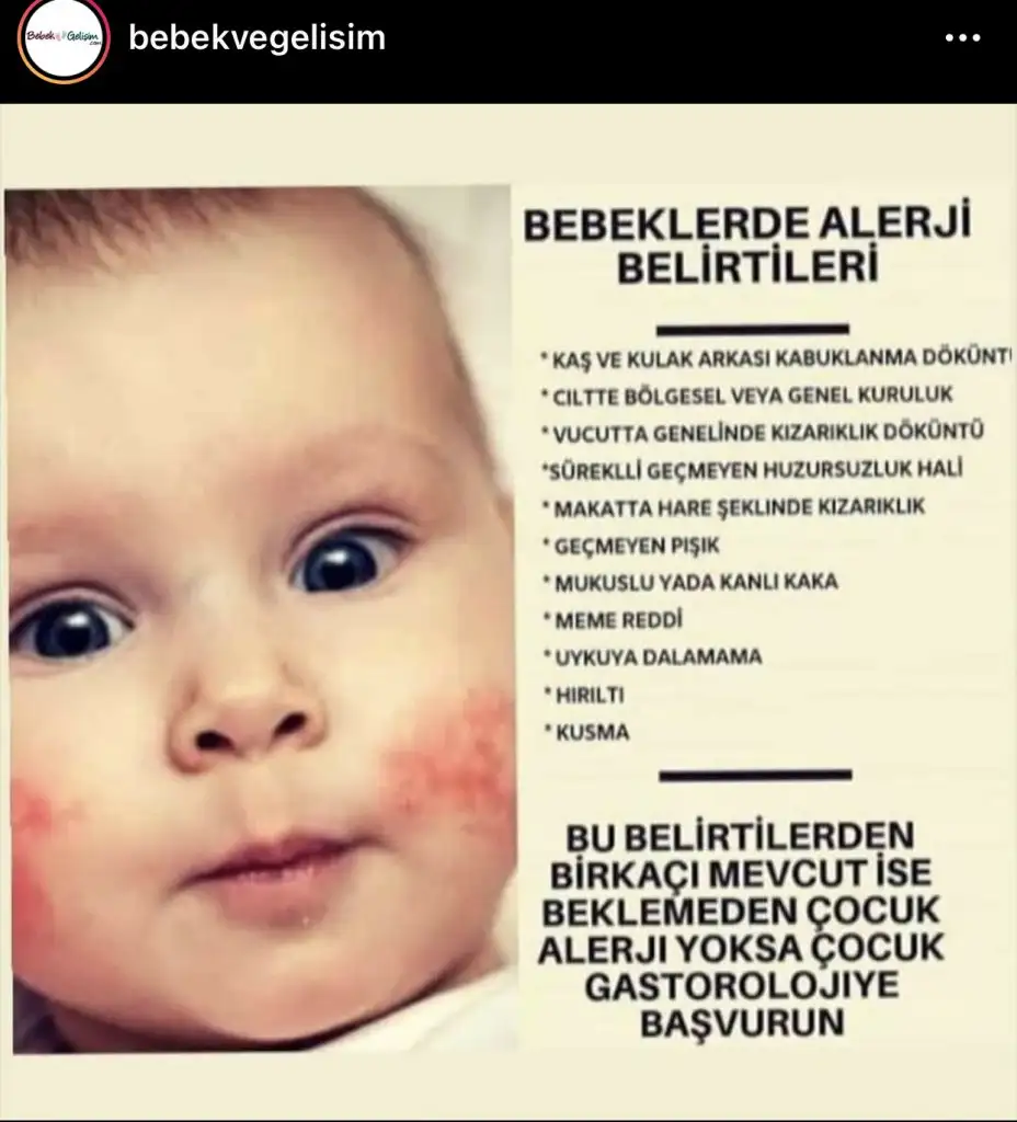 Haklısın bu konuda ama işte geçsin diye ben herşeyden vazgeçtim. Bi deneyeyim dedim yüzündekiler biraz gitti gibi ama mukus devam ediyor. 6 aydan önce de alerji testi yapılmıyor diye biliyorum deneye deneye bulacaz artık, benim minnoşum alerjiden dolayı uyuyamıyomuş çünkü uykuya dalamama alerjinin en büyğk etkisiymişKızlar bu alerji için diyetleri kafanıza göre burdan duyduğunuz şekillerde yapmayın, kendinize eziyet etmeyin hemde herkesin alerjisi farklıdır . Süt ve süt ürünleri dana etiyle çapraz alerjendir mesela bazılarında sadece sütü kesersin alerji devam eder çünkü dana etine devam ediyordur . Aynı şekilde tavukla yumurta da öyledir . Diyet listenizi doktorunuz oluştursun benden tavsiye belki de alerjiniz yok sadece intoleransınız var boşuna diyet yapıp sütünüzü etkilemeyin.