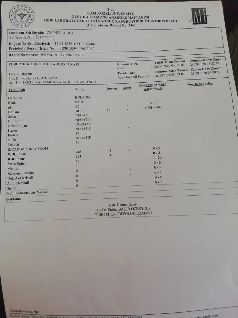 Geçmiş olsun su az mı içiosun dansite de yüksek... Enfeksiyonun en iyi tedavisi bol su... Kum dökme gibi Bi durumun var mı eritrosit de yüksek... Benimde normalde 5in üstünde kum döktüğüm söyleniyor hep... Ev yapımı yogurt yemeye çalış... Antibiyotiğini de al kuzum. Hamilelikte kullanabileceğin bir şey vermişlerdir mutlaka...Kızlar dun gece karın agrısı ile acıldeydım serum taktılar tahlil yaptılar tahlil sonucuma bakabilir misiniz antibiyotik verdi acık doktoru ama kullanmaya korkuyorum kendi doktoruma da ulasamadım napsam bilemedim