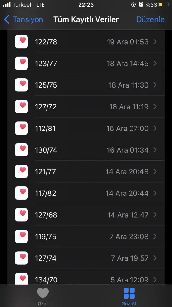 32de kontrole gittiğimde doktorum tansiyonun nasıl gidiyor diye sormuştu. Ben öncesinde ara ara ölçüm yaptığımda 110-125/ 65-75 arasında ölçüm aldım son birkaç haftadır yapmadım dedim. Sonuçlar güzel ama arada kontrol etmeye devam et demişti. Dün akşamdan beri ölçüm yapıyorum sonuçlar resimdeki gibi. Küçük 80 üzeri dediğini hatırlıyorum büyük için ne dedi hatırlayamıyorum.