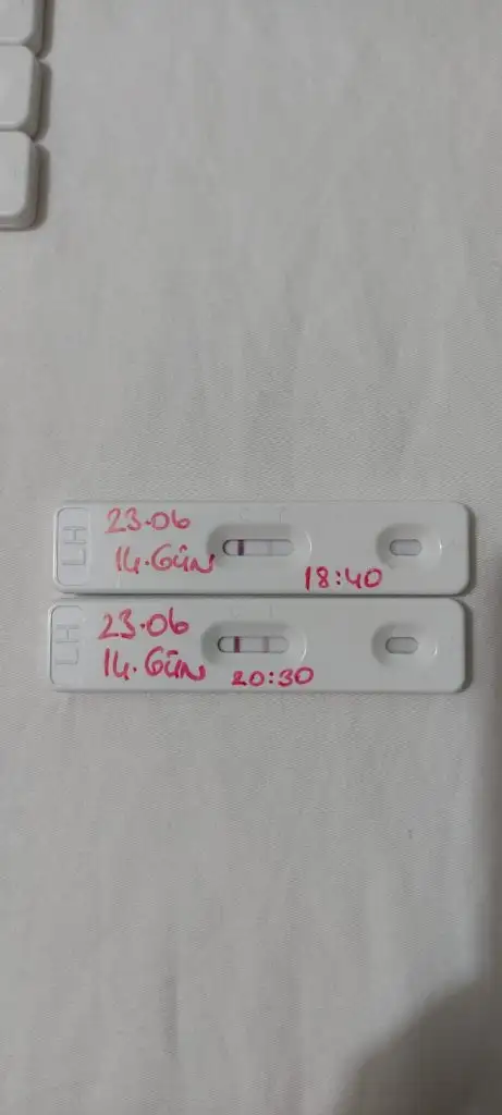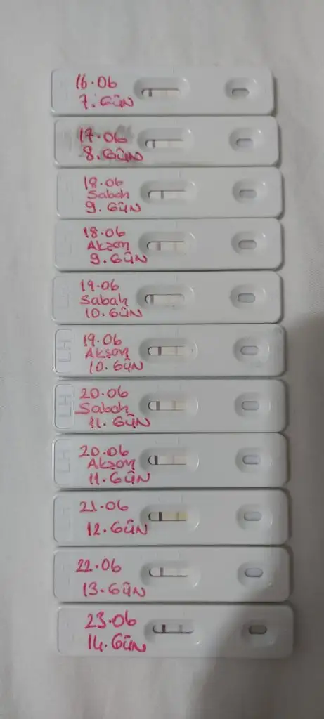 kızlar şu testlerime bir bakar mısınız? bugün yaptığım test önceki günlere nazaran daha koyu çıktı ama bugün bir saat 18:40 ta yaptım o baya silikti sonra 20:30 da yaptım o da daha koyuydu bunun olması normal mi? sizce ne zaman pik görürüm :110: