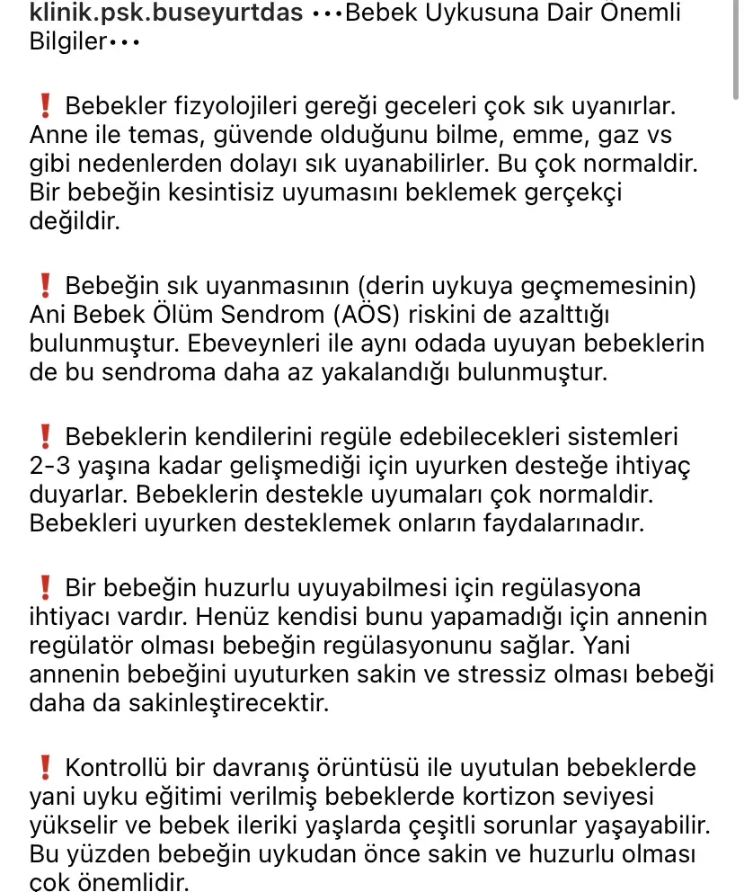 Ben de hiç saymıyorum :) gece uyansın sorun değil emziririm geri uyur ama gündüz uykularımız çok perişan bazen tüm gün boyunca sadece yarım saat uyumuş oluyor hem o hem ben tükeniyoruz. Zaten kızgınlığım da hep kendime oluyor beceremiyorum yapamıyorum diyeUyku konusunda dertli olan annelerim için; ben de cok taktım kafaya yarım saat, 40 dk delirecek gibiydm bir ara. Sonra ne kadar nasıl uyuduğunh, gece kaç kez uyandığımızı saymayı bıraktım ve rahatladım. Sonra sonra baktım ki bebeğim de huzurlu oldu. Paylaşacağım görseldeki bilgiler bir nebze rahatlatır belki sizi de.