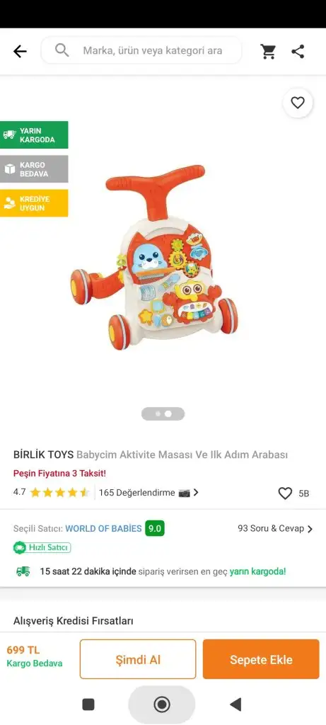 Merhaba eşim bu ürünü almış babymall den 550 TL ye çok memnun kaldık oyuncakları da işlevsel müzik kutusu vs var . Öyle hafif değil gayet güzel sürüşü ki daha ağır olmasını isteyenler için içine su doldurulup ağırlık yapılabiliyor . Bir kaç yorumda yürüme arkadaşı araştıran arkadaşları gördum tavsiye ederimYa alırken yorumlara aldanıp aldım ama daha o tutacak yerinden tutarken kayıp gidiyor ben anlamadım neden okadar hafif yapmışlar ? Mantık olarak yürüme arkadaşının kaymaması , yere biraz sağlam basması gerekir ama hiç öyle değil, belki başka yürüme arkadaşları vardır bende araştırıcam ama bunu hiç sevemedim