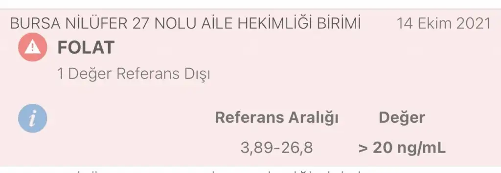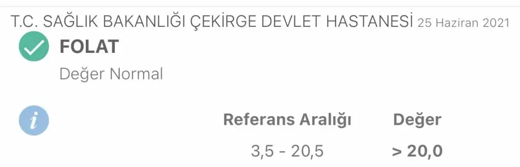 Kız niye korktun kiKızlar sizler beni çok korkuttunuz. Benim gebeliğim planlı bir gebelikti. Hamile kalmadan 3 ay önce kadın doğum doktoruna gidip bütün kontrollerimi yaptırmıştım. Kadın doğumcu 3 ay önceden folikasit kullanmam gerektiğini söylemişti. Folidoceyi önermişti. Her gün 1 tane alıyorum. Aradan 15 gün geçtikten sonra daha detaylı tahlil için dahiliye gitmiştim. 25 Haziran yazan folik asit kullanmaya başladıktan 15 gün sonraki değerim. Dahiliye doktoru her şey normal demişti. 3 ay kullandım ve 3 ayın içinde hamile kaldım. Hala daha kullanmaya devam ediyorum. Kırmızı olan 14 ekim yazan da hamileykenki folad değerim. Napayım ben şimdi. Çok korkum. Gebeliğim bugün itibari ile 8+6