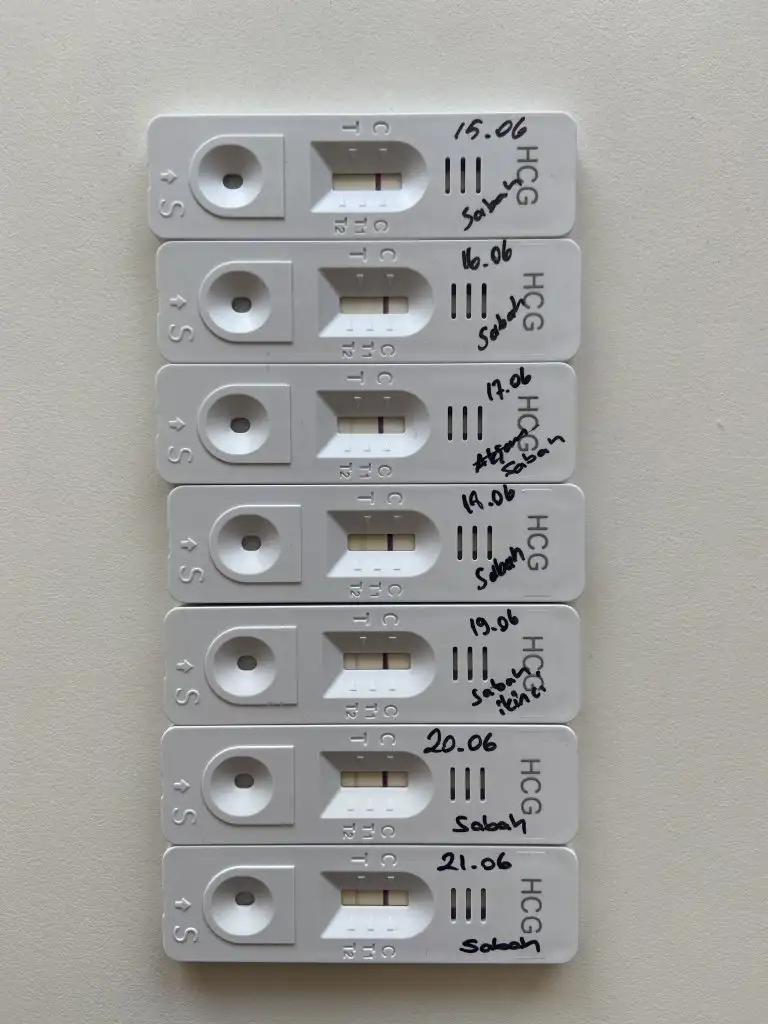 Herkese merhaba. Bat 18 Mayıstı. Yumurtlamam ne zaman bilmiyorum. 16 haziranda beta hcg:13,48 çıktı. Pazartesi 37,5 çıktı. Ve bir haftadır idrar testi yapıyorum her sabah az da olsa koyulaşmalar var ama bariz şekilde değil. Ve bugün sanki bir tık açık renkte çıktı. Dün çok karnım kasıklarım ağrıdı gece. Adet oldum sanarak lavaboya gittim ama henüz kanamam olmadı. Dr. a gittim Cuma beta hcgye bakalım 150 üstü çıkarsa sorun yok dedi. Ama testler koyulaşmıyorböyle giderse 100 bile olmayacak gibi değil mi? Bu idrar testleri iki çizgi aynı koyulukta beta kaçken oluyor bilgisi olan varsa yazabilir mi? Ya da benim gibi olup hamile kalanlar lütfen yardım edin Cevaplarınızı sabırsızlıkla bekliyorum Teslerimi attım ilk attığım beklediği için kurumuş olan testler. İkinci attığım dün ve bugün sabahki ilk 5 dkda çektiğim testler...