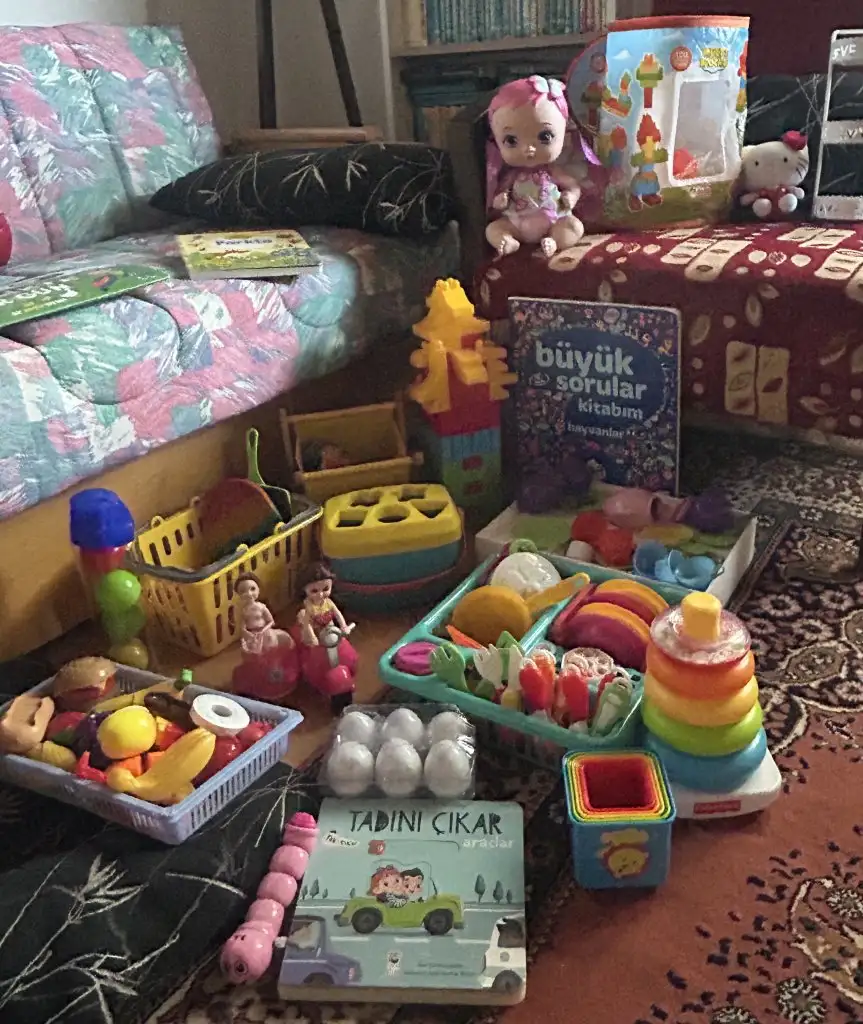 Bizdede opuyo gezdiriyo bazen birseyler yediriyo sonra firlatip.atiyo kısa süreli oynuyor. Ben hizli gidiyorum.sanki hala eğitici oyuncak yaşı sanırım bayram haşlıgıyla birseyler slmak istiyorum egitici oyuncak bakıyımBul tak oyuncagi şuan ilgisini çekiyor. Üçgen yuvarlak kare dikdörtgen şekillerine göre takıyor yerine. Bizim en çok zaman geçirdiğimiz şey bu " Büyük sorular kitabım hayvanlar" aşırı ilgisini çekiyor, hayvanlara tek tek bakıp seslerini çıkartıyoruz hikaye uyduruyorum. Hav hav nerde diyorum gösteriyor vs vs baya büyük kitap zaten ve renkli, işimizi görüyor şu sıra