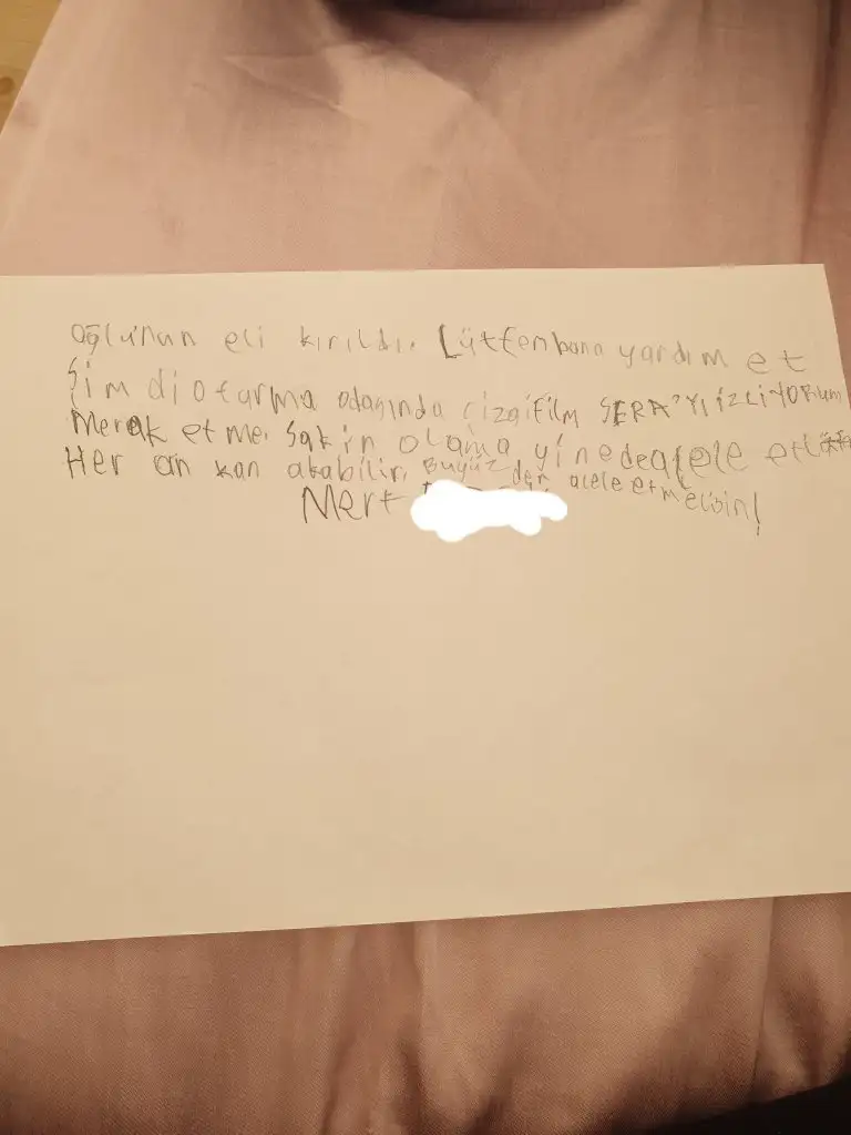 Sadece 20 dakika yattim ,uyuyamadım ama inatla gözümü açmadım. Önce merdane ile müzik yapıyorum diye gürültü yaptı, sonra odaya giriyor ,çıkıyor bir kağıt bırakıyor yanıma. O çıkınca baktım kağıda yüreğime indi ,şapsik yaaaa. Elini legoya bastırmış sıyrılmış, bana yazdığı nota bakın, yüreğime indirdi Eki Görüntüle 3029609
