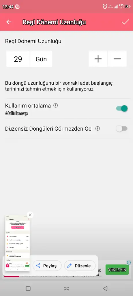 Suanki ortalama 29 gün regl döngü uzunluğu da 33 gün diyor son 4 aya göre 29 günde bir diyor bak tekrar atıyorum otomatik ayarı açınca böyle diyo bu yüzden anlayamıyorum yumurta akı 26 Mart'ta geldi 2 gundurde beyaz akıntı var kokusuz krem gibi