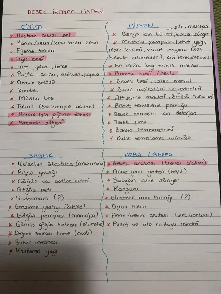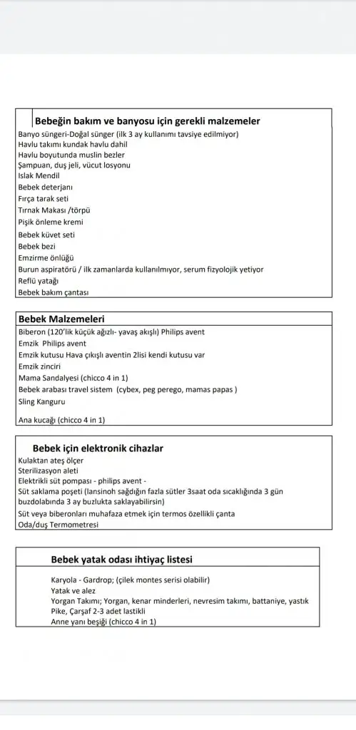 Canıım, benim listem de böyle . Sudocream den vazgeçtim galiba içeriği temiz değilmiş . Bi de elektrikli ana kucağını çok methettiler bana kuzenlerim ama bazı çocuklar durmuyormuş içinde, şu an onu düşünme aşamasındayım . Aklıma gelenleri yazdım genel olarak hepsini almam büyük ihtimal ama elimin altında gerekli olabilecek her şeyi listelemek istedim belki fikir olur senin için de 😘