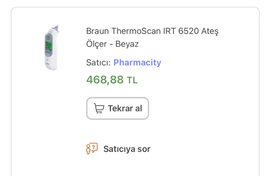 Dimi 500lira bi ates olcer ama sasirmiyorum artik. Esim de diyo neye ihtiyac varsa al gitsin bekleme. Hatta toplu hepsini bi yerden alalim diyo da ama oyle daha pahali. Yani bu hafta ici 8 tane farkli kargo gelecek banahayırlı uğurlu olsun ben braundan memnun kalacağına eminimama fiyatlar çok yüksek bir ateşölçer nasıl 500 TL olabilir hayret doğrusu