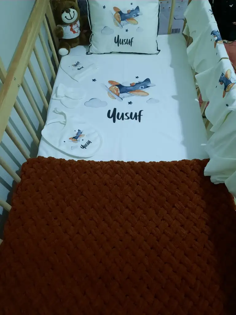 Cok guzel dusunulmus bir hediye , halaya tesekkurlerKızlar eşimin halası (2. Annesi gibidir) bize böyle bir sürpriz yaptı. Hastane çıkışı almış tam takım ve isimli. O kadar beğendim ki hemen beşiğine serdim hepsini görmek içinRabbim giyindiği günleri de göstersin inşallah ayıcık eşimin bana hediyesiydi. Battaniyeyi de ben ördüm❤