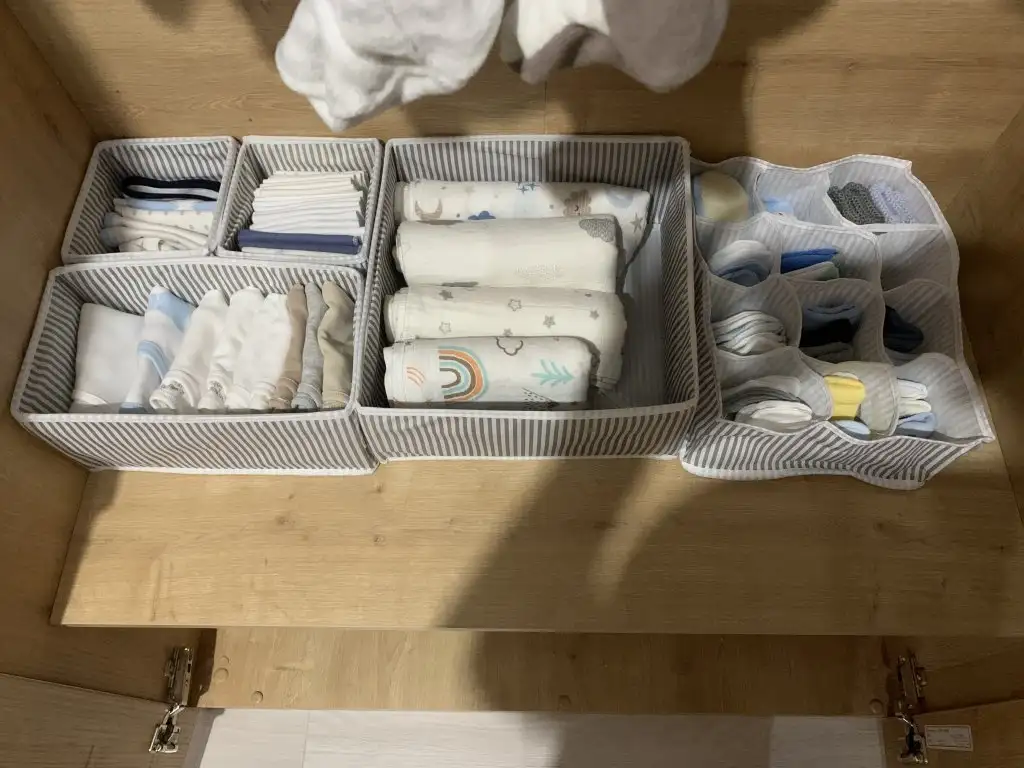 Annem ütüledi sağolsun hepsini ben de oturduğum yerde katladım. Daha önce hiç bebek kıyafeti katlamamış biri olarak o minik minik şeyleri bir düzene sokmak baya zamanımı aldı