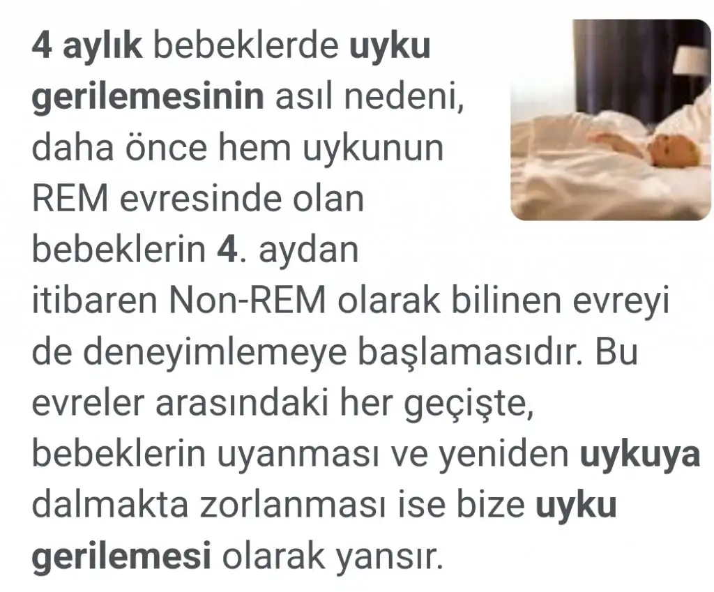 Uyku gerilemesi dediğiniz 4. Ay hangisi şu anda olduğumuz mu, yoksa gireceğimiz ay mı?4.ay bitiminde tekrar denersin şu kriz dönemi gecsin .4.ay milat diyorlar ya düzenli bebeklerin bile düzeni bozulabiliyormuş.