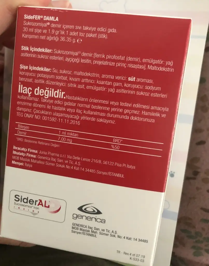 Biz sidefer kullanıyoruz demir için kakayı boyamadı her kilo için 1 damla ama alerjik bebeği olanlar dikkat içeriğini okuyun süt tozu olanlar var eğer diyeti açmadıysanız o dokunabilir bebeğe