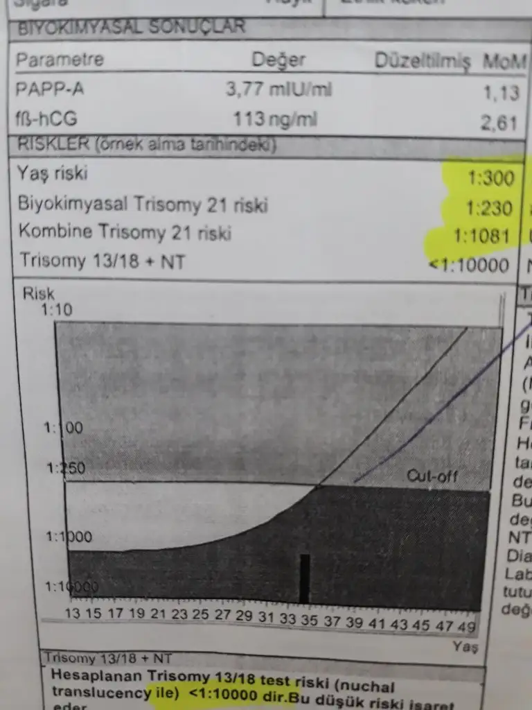 Şimdi arkadaşlar ben 12. Haftada ikili tarama testi yaptırdım sonuçlarında risk düşük çıktı. Sadece free beta hcg Mom değeri düşük çıktığı İçin doktorum sorun olmaz sadece daha sık değerlendirilmen gerekiyor demesine rağmen içim içimi yediği için 14. Haftanın son gün bir daha ikili test yaptırdım. İkinci test sonucu benim için adeta bir şok ve hayal kırıklığı oldu. Başka bir hastanede yaptırdığım ikinci test sonucunda free beta hcg Mom değeri normal çıkmasına rağmen bir anda trisomy 18 değeri 155/1 kadar yüksek riskli çıktı. Ben bunu görünce şok oldum tabi. Doktor keşke ikinciyi yaptırmasaydın kuyuya taş atmış oldun dedi mecburen nifty testi yaptıracağız. Korkular denizinde sürükleniyoruz eşimle beraberşimdi iki test sonucunu da buraya yüklüyorum lütfen bana yardımcı olur musunuz çok korkuyorum.
