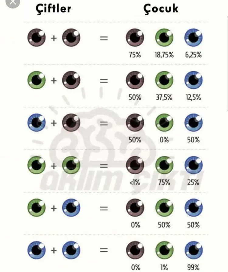 Bizimde benim mavi, eşimin kahverengi %50 , %50 oluyomuş mavi kahveKızlar haydi tahmineBenim gözlerim ela, eşimin mavi-yeşil karışımı. Demek ki renkli olma ihtimali daha yüksek
