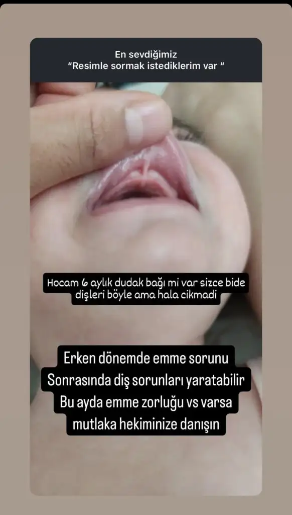Canım dıslerın fotografı var mı?Ben de bilemedim ki. Dişler ayrık çıkmıştı bizim. Tam bunun üzerine instagramda Osman hoca da paylaşım yapmıştı. Dişler ayrık çıkarsa müdahale gerekir. Belki diş ayrıklığına göre karar veriliyor. Bazen dudak bağları ince olup zamanla geçebiliyormuş. Ama bizim dişleri ayıracak kalınlıkta idi.